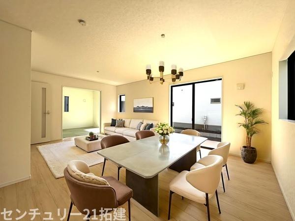 リビング 4月3日撮影♪朝は爽やかな日差しを浴びながら、家族みんなでおいしい朝食。昼下がりには読書やお昼寝でもしながらのんびりと過ごすひと時…。家族が集まる空間を、一番明るい空間に♪家具はCGになります。