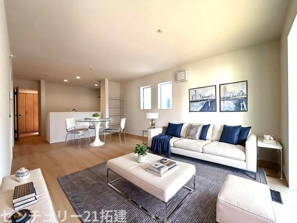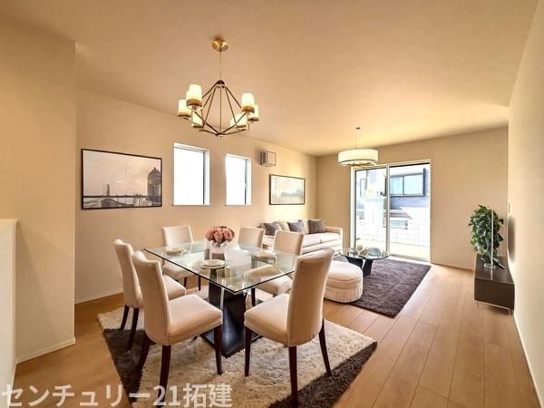 リビング 3月6日撮影♪朝は爽やかな日差しを浴びながら、家族みんなでおいしい朝食。昼下がりには読書やお昼寝でもしながらのんびりと過ごすひと時…。家族が集まる空間を、一番明るい空間に♪家具はCGになります。