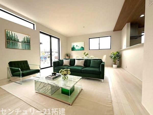 リビング 3月27日撮影♪朝は爽やかな日差しを浴びながら、家族みんなでおいしい朝食。昼下がりには読書やお昼寝でもしながらのんびりと過ごすひと時…。家族が集まる空間を、一番明るい空間に♪家具はCGになります。