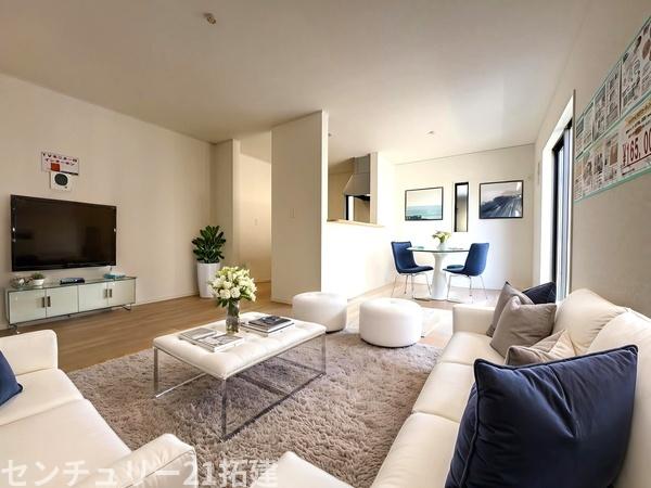 リビング 4月3日撮影♪朝は爽やかな日差しを浴びながら、家族みんなでおいしい朝食。昼下がりには読書やお昼寝でもしながらのんびりと過ごすひと時…。家族が集まる空間を、一番明るい空間に♪家具はCGになります。